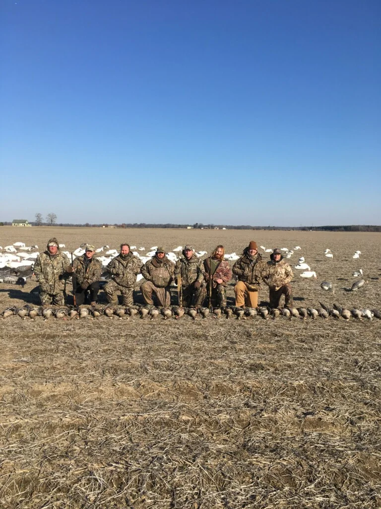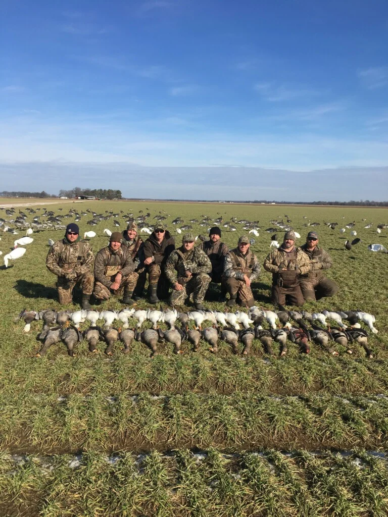 Arkansas county guide service offers both morning and afternoon specklebelly goose hunts. Specklebelly goose hunts take place in flooded and dry agricultural fields in layout blinds, pit blinds, A frame blinds, or wearing white suits. The situation of how we hunt specklebelly's vary with the weather conditions and how the migration is at that point in the season. For a typical morning hunt the guide will give information on the hunting setup and conditions the evening before the goose hunt. The group hunting will either leave from our lodge following the guide to the field, or be given a location to meet at the morning of the hunt. Following arrival to the field, the guide will give everyone information on what will be going on for the morning hunt and the setup. We recommend to use a 12 gauge shotgun with bbs or T shot.